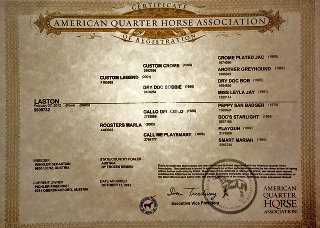 Rasse: Quarter HorseGeb.: 2012Farbe: BrownSire: Custom Legend (2001)Dam: Roosters Marla (2003)